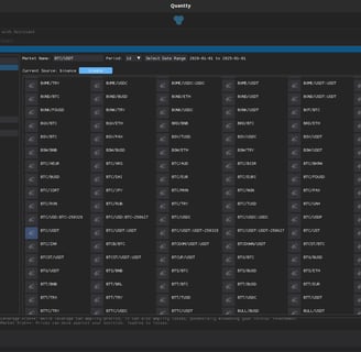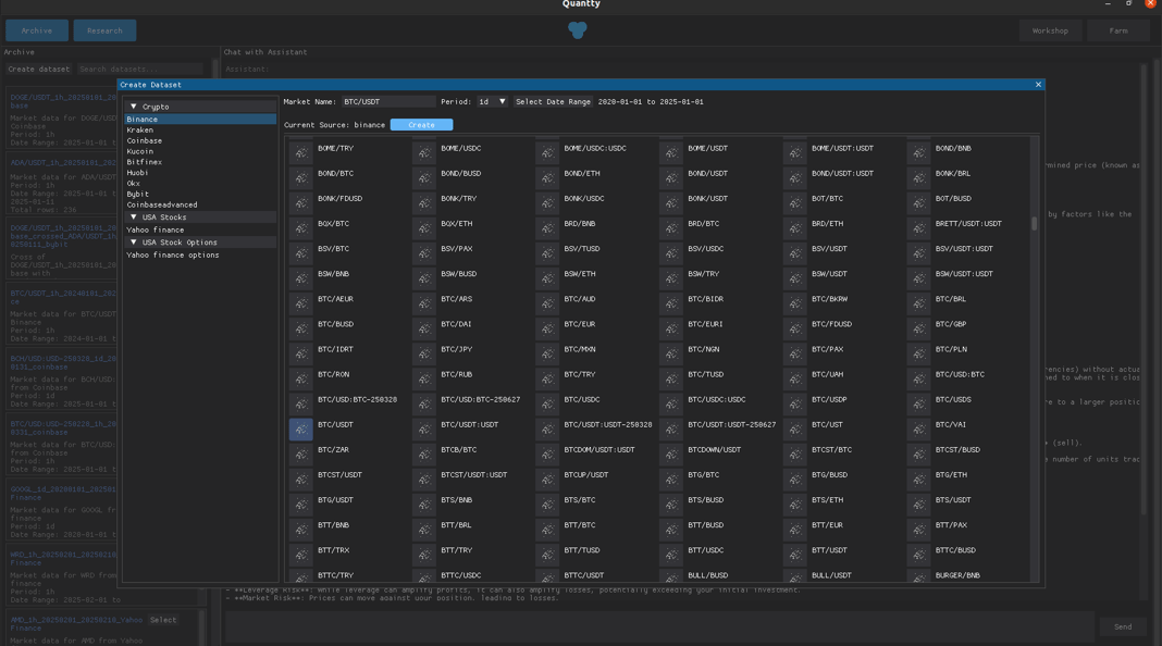 Gonna use the Quantty platform, since it would be easier with it. We will head first to the Archive, and click on Create dataset, lets choose the Binance source, wait for the symbols to load, choose BTC/USDT, let the date range go from 2020-01-01 to 2025-01-01, choose period 1d and click on create.