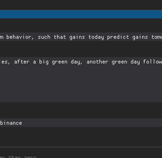 The previous observation could be denoted more formally as: "Bitcoin prices exhibit momentum behavior, such that gains today predict gains tomorrow (and vice versa)." Momentum is the tendency of things to keep going in a direction, since it takes effort to stop them or change their course.