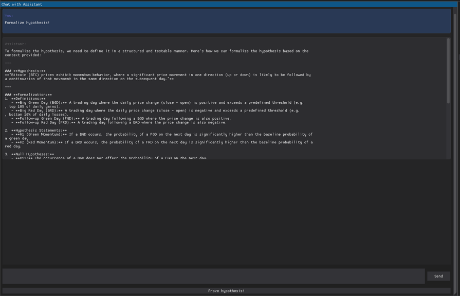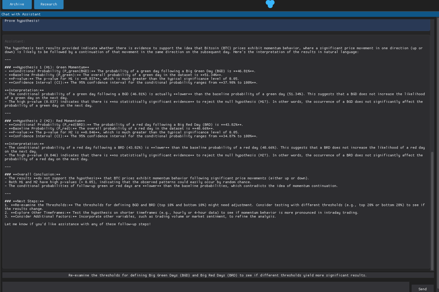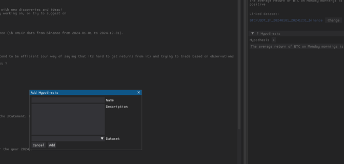 we can give it more guidelines if you want, but i will just click in prove hypothesis (it will generate the code required to process the linked dataset, and also interpret the result, so it takes a couple of minutes to do it)